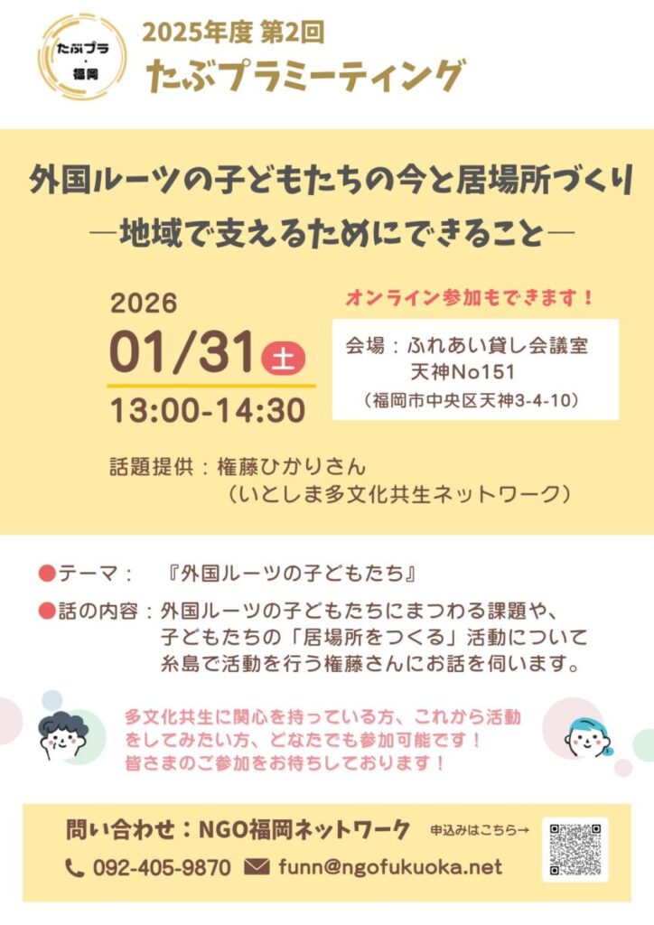 2025年度第2回目のたぶプラミーティングは「外国ルーツの子どもたち」をテーマとし、「いとしま多文化共生ネットワーク」の権藤ひかりさんにお話をしていただきます。